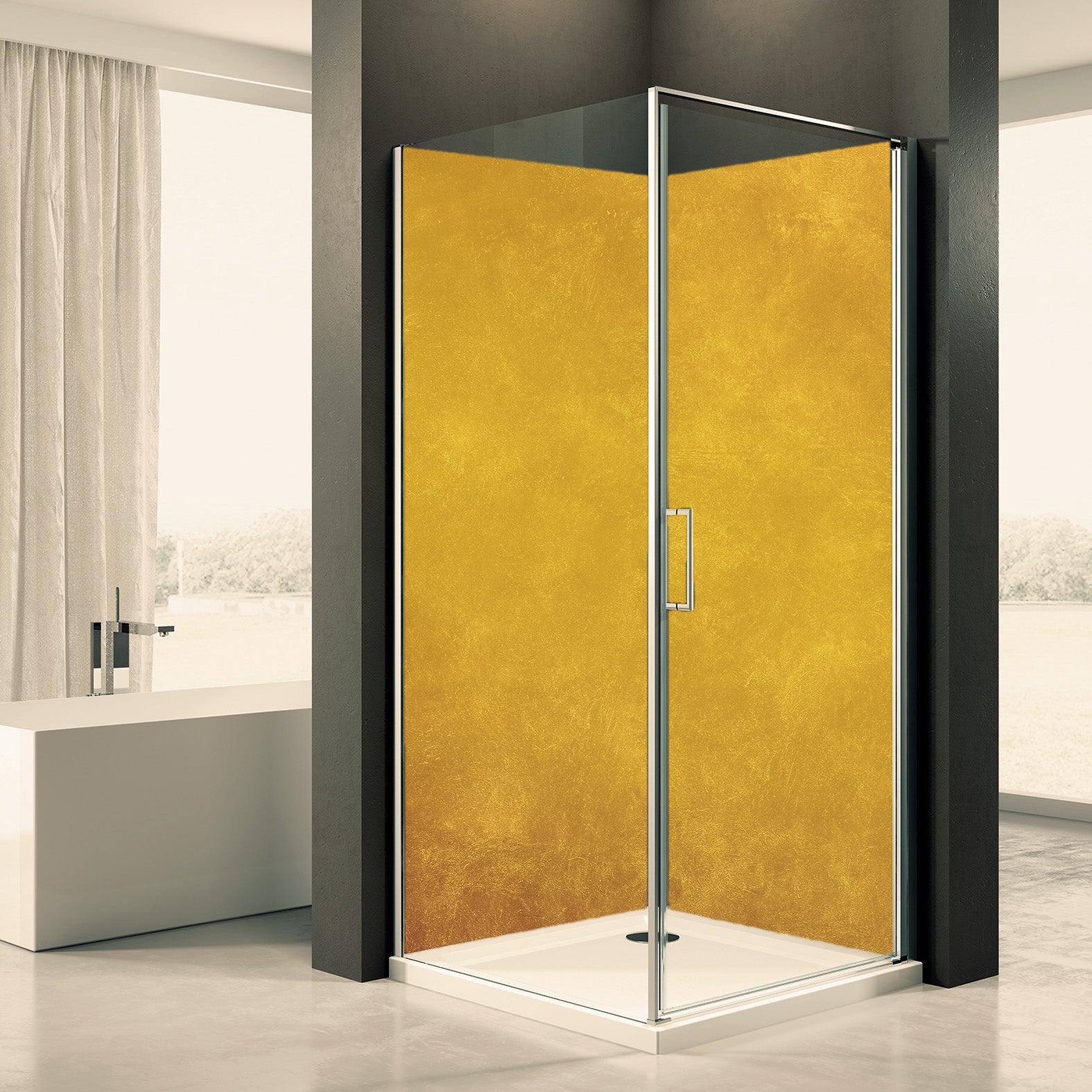 Deine Duschrückwand wird gefertigt aus einer 3mm starken Aluminiumverbundplatte. Eine Alu-Verbundplatte besteht aus zwei Aluminiumschichten und einem Polyethylenkern die unsere Duschrückwände besonders stabil und wasserdicht machen.