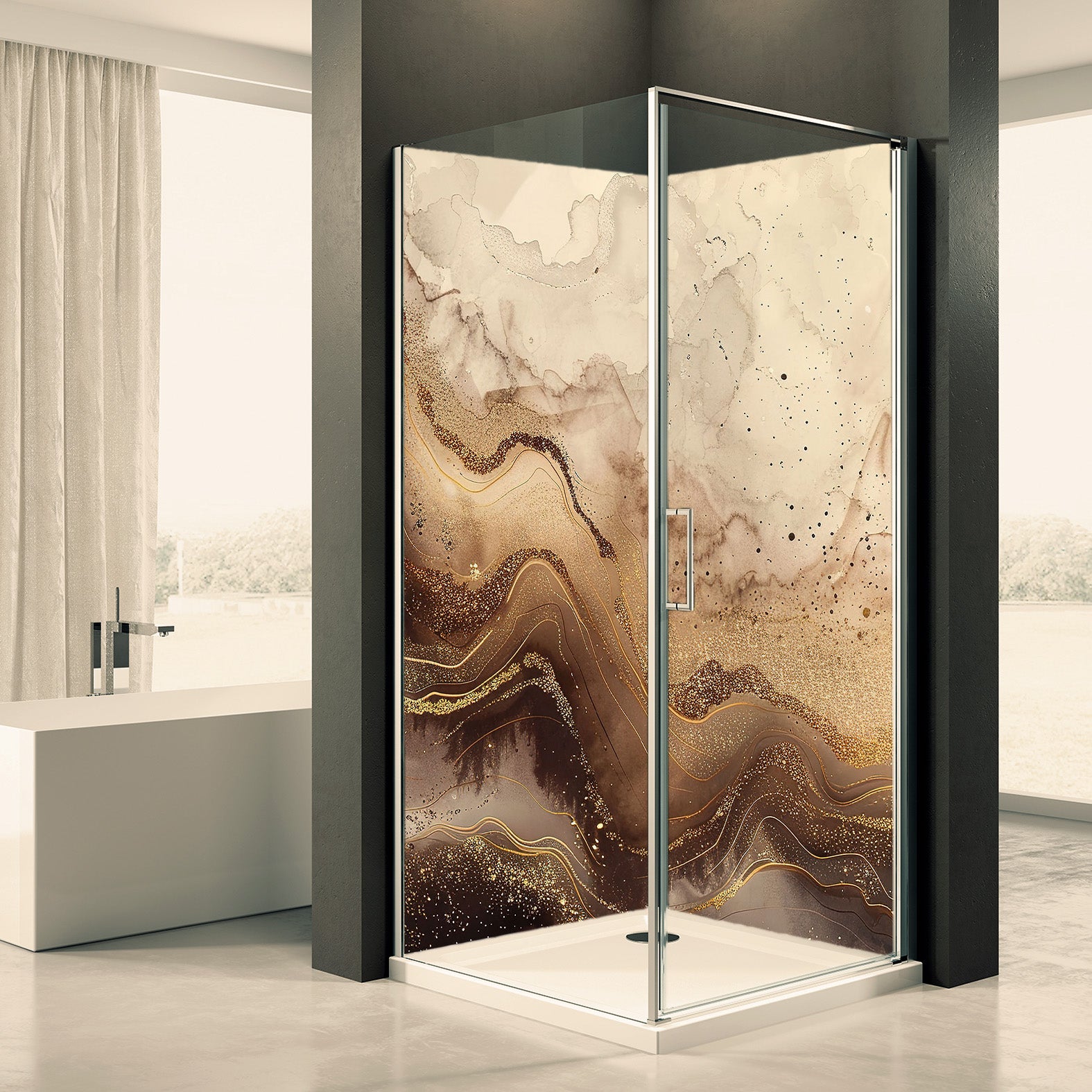 Deine Duschrückwand wird gefertigt aus einer 3mm starken Aluminiumverbundplatte. Eine Alu-Verbundplatte besteht aus zwei Aluminiumschichten und einem Polyethylenkern die unsere Duschrückwände besonders stabil und wasserdicht machen.